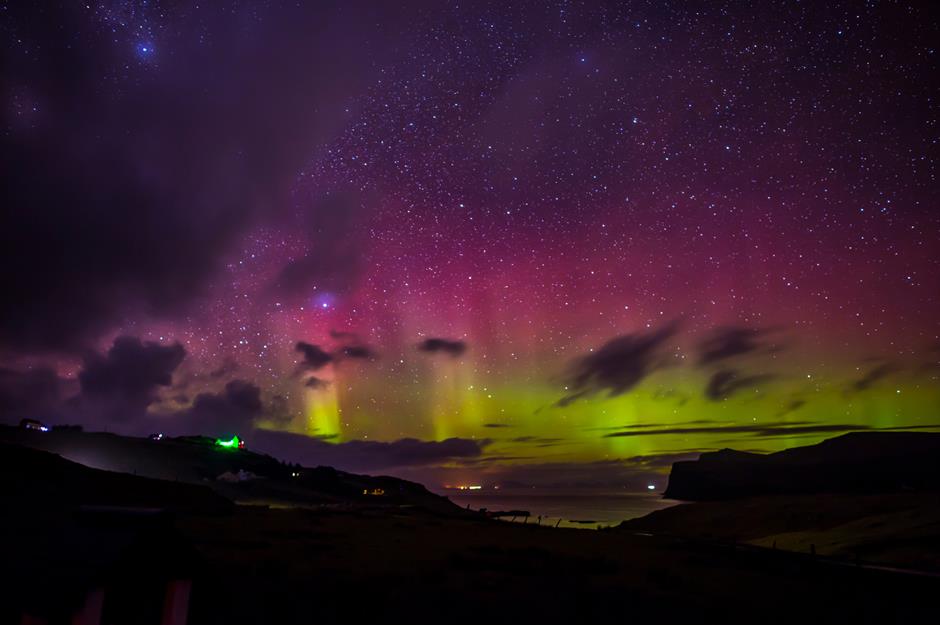 Aunque es menos habitual, también es posible ver auroras boreales fuera del Círculo Polar Ártico. En Escocia, la isla de Skye con su costa escarpada y paisajes dramáticos— ofrece algunas oportunidades, especialmente en otoño. Eso sí, las auroras aquí suelen percibirse como luces blanquecinas o grises a simple vista, revelando sus colores reales solo a través de largas exposiciones fotográficas.