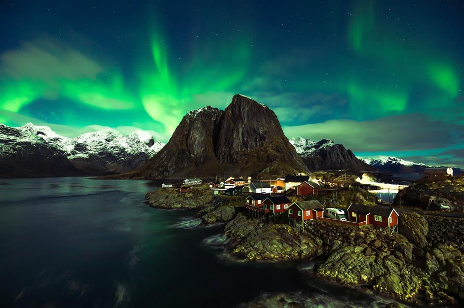 El archipiélago de Lofoten combina picos afilados, aguas tranquilas y pintorescos pueblos pesqueros. Situadas bajo el óvalo auroral, las islas ofrecen excelentes condiciones para ver auroras desde finales de verano hasta otoño.