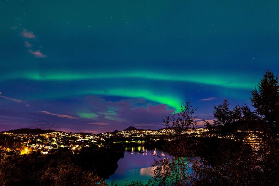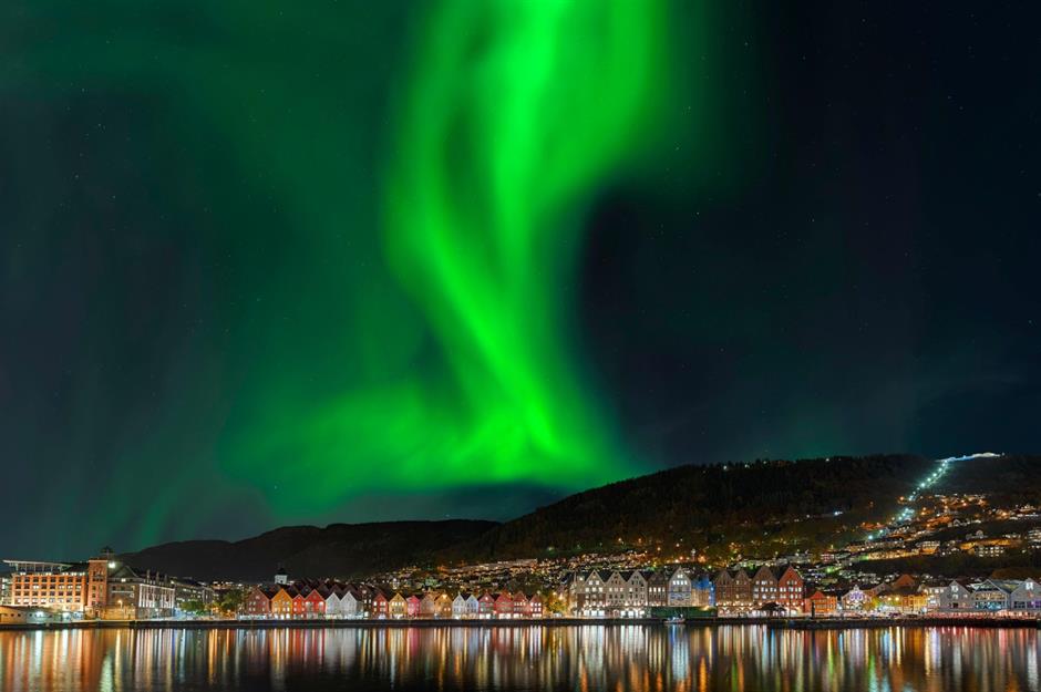 Fotografiadas aquí en septiembre de 2021, las auroras boreales se asemejan a un halo verde resplandeciente sobre la ciudad. Bergen es uno de los destinos más populares de Noruega, famoso por su muelle hanseático, reconocido por la UNESCO, que fue un importante centro de comercio entre Noruega y el resto de Europa entre los siglos XIV y XVI.