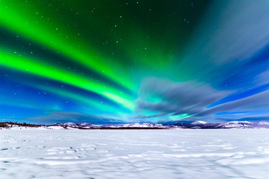 El Yukón es especialmente apreciado por sus paisajes nevados y la posibilidad de combinar la observación de auroras con actividades invernales como trineos tirados por perros, motos de nieve, vuelos panorámicos o baños termales al aire libre.