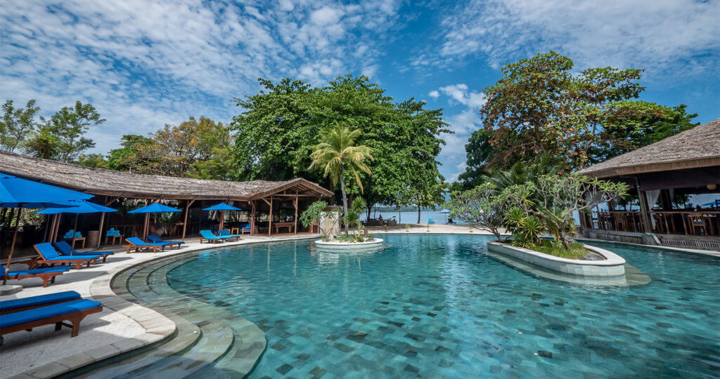 El Resort está ubicado en el lado oeste de la isla, en un tramo de 300 metros de playa de arena blanca y aguas cristalinas frente al volcán Manado Tua, donde los huéspedes pueden disfrutar de impresionantes puestas de sol durante todo el año.