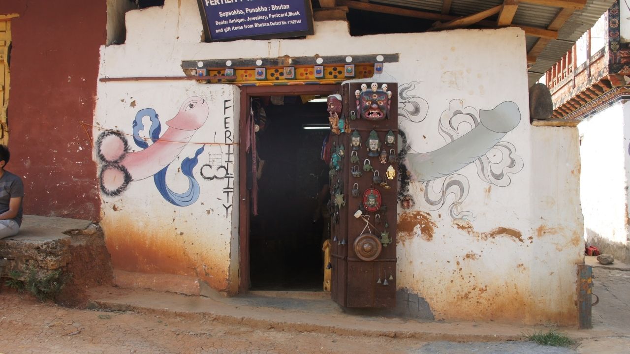 Sorprende mucho ver penes pintados en las paredes de las casas y colgando de algunos tejados. Se usan para ahuyentar los demonios y los malos espíritus de las casas. Esto tiene su raíz en la leyenda de Drukpa Kuenleg (o Kunley), quien usó su falo para dominar a los demonios.