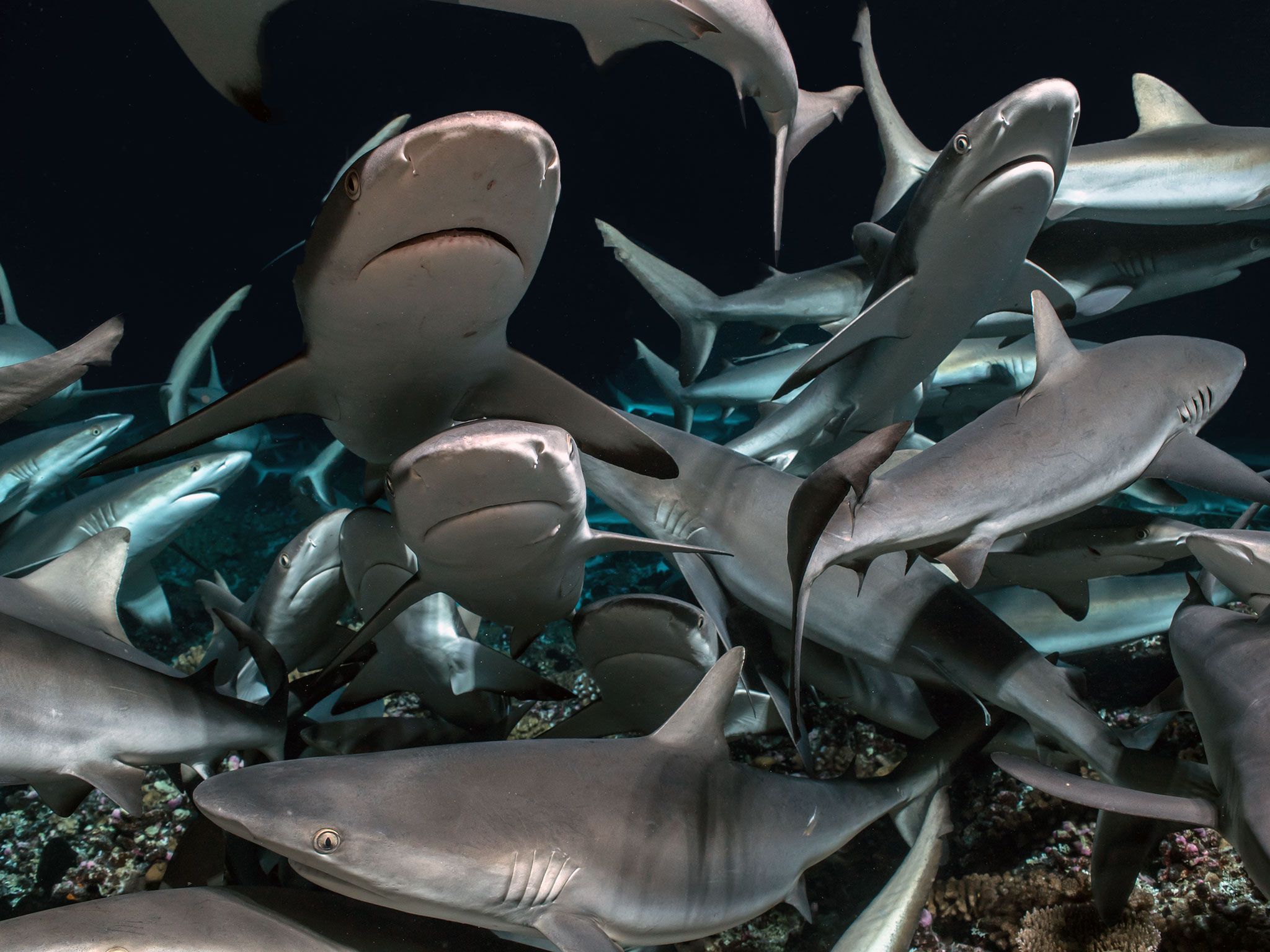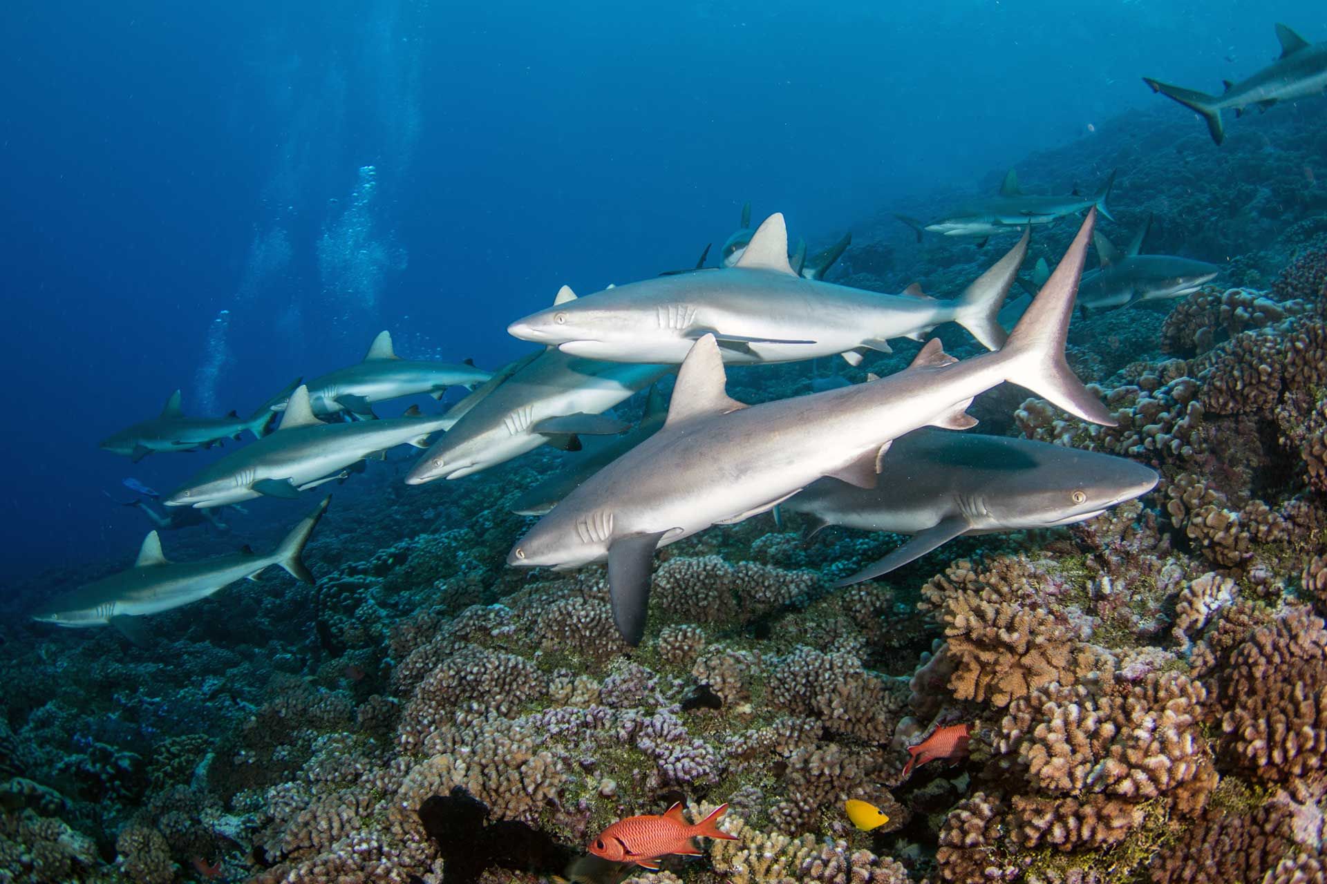 Fakarava es Reserva de la Biosfera por la UNESCO, y bajo sus aguas se esconde una sinfonía de vida en su estado más puro. En el paso sur, el mítico sitio conocido como “La Muralla de Tiburones” (Shark Wall), ofrece una experiencia que desafía cualquier descripción: cientos de tiburones grises de arrecife nadan en perfecta armonía, sin agresividad, sin miedo, como guardianes de un reino donde el ser humano solo puede observar.