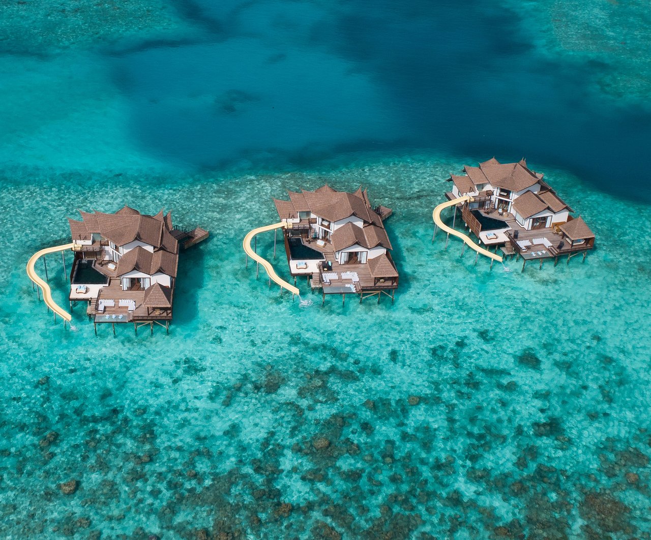 - Villas sobre el agua con piscinas privadas y acceso directo a la laguna.